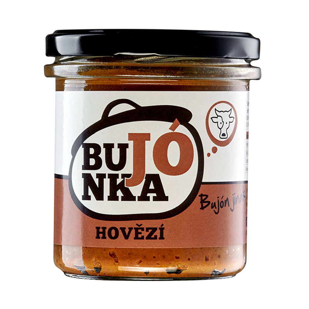 Hovězí bujónka je jemná pasta plná chutí, vyrobená pouze z přírodních surovin nejvyšší kvality - z masa z českých farem, čerstvé zeleniny, bylinek, koření a soli. Bujón neobsahuje žádnou chemii, lepek ani laktózu a proto je vhodný pro alergiky a dietní stravování. Pasta slouží k jednoduchému a rychlému ochucení polévek, omáček a masových i zeleninových pokrmů a směsí, stejně tak dobře, jako k ochucení příloh.