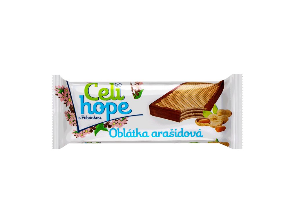 Arašídová oplatka Celihope je bezlepková oplatka s krémovou arašídovou náplní (63%) máčená po obvodu v kakaové polevě. Oplatka obsahuje rutin a kyselinu listovou, je vhodná pro celiaky a je rychlým zdrojem energie při fyzické zátěži, sportovních výkonech, v práci nebo při cestování.