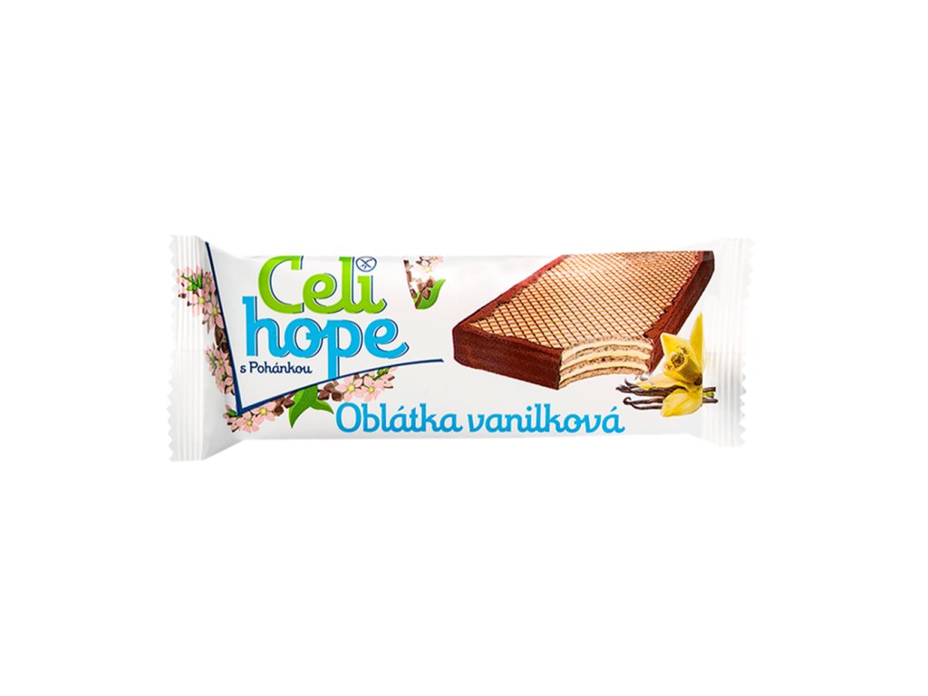 Vanilková oplatka Celihope je bezlepková oplatka s krémovou náplní (63%) s vanilkovou příchutí a fruktózou, po obvodu máčená v kakaové polevě. Oplatka obsahuje rutin a kyselinu listovou, je vhodná pro celiaky a je rychlým zdrojem energie při fyzické zátěži, sportovních výkonech, v práci nebo při cestování.