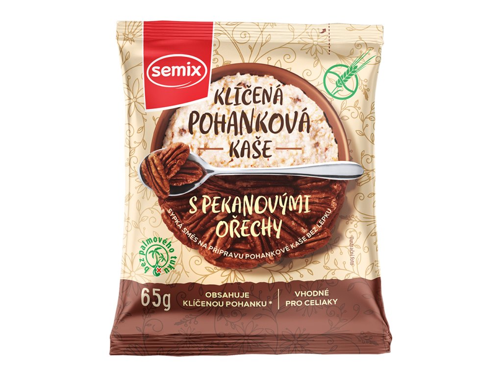 Nabídka pohankových bezlepkových kaší společnosti Semix obsahuje kaši s pekanovými ořechy , chia s jablkem a skořicí a čokoládovou pohankovou kaši.