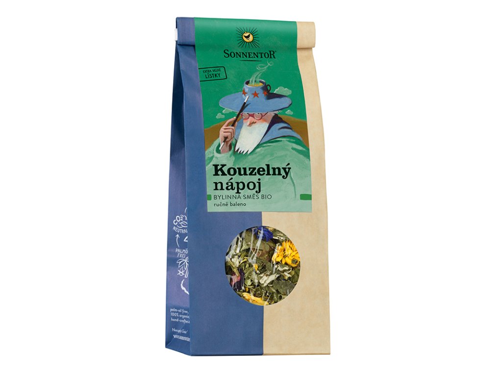 Čaj Kouzelný nápoj je sypaná, ručně balená bylinná směs v bio kvalitě. Síla bylin je téměř magická. Kouzelný nápoj se třpytí sytou zlatou barvou, vyčaroval totiž spolu s meduňkou, lipovými květy, mateřídouškou a růžemi i kus léta. Chutná výrazně květinově se svěžími, lehce trpkými tóny a výborně se hodí ke koláčům, sorbetům, ovoci a tvarohu. Skvěle doprovodí vaši snídani.
