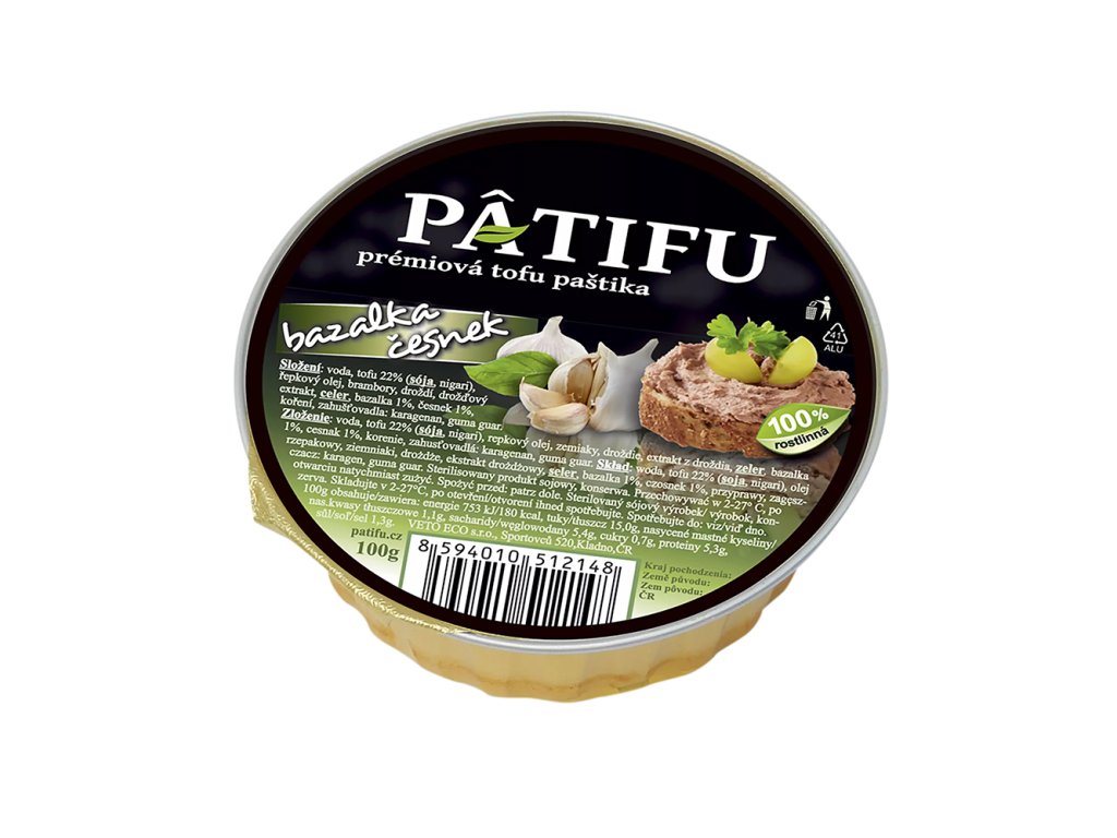 Paštika s bazalkou a česnekem od české společnosti Veto Eco je rostlinná paštika s jedinečnou chutí bazalky a česneku v kombinaci s prémiovou tofu paštikou. Tato paštika v praktickém balení je vhodná k využití pro rychlou svačinku nejen doma, ale také v práci, na výletech nebo při cestování. Tofu je sójový sýr, který se vyrábí srážením sójového mléka a obsahuje velké množství bílkovin, vápník, hořčík, vitamin A a kyselinu listovou. Dále je zdrojem esenciálních aminokyselin a může obsahovat i další minerály jako je železo, mangan, měď, selen, zinek a fosfor.